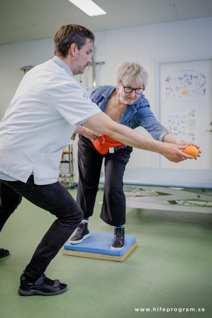 För att uppnå optimala effekter av balansträning på balansförmåga och förebyggande av fall rekommenderas att den posturala stabiliteten utmanas och att svårigheten gradvis ökar allt eftersom deltagaren förbättrar sin balansförmåga.3,17-19 En systematisk litteraturöversikt rapporterade att träningsprogram som innehöll övningar som utmanade den posturala stabiliteten hade en större relativ effekt på förebyggande av fall.19 American College of Sports Medicine (ACSM) rekommenderar att balansträning innehåller följande: (1) progressivt svårare positioner med gradvis minskande understödsyta; (2) dynamiska rörelser som påverkar tyngdpunktens position; (3) övningar som belastar posturala muskelgrupper; och (4) övningar som reducerar sensorisk information, till exempel från synen.3 För att säkerställa att balansprogrammet förblir utmanande över tid måste det progredieras. Det är också viktigt att balansövningarna kan utföras på ett säkert sätt. Således behöver utmanande balansövningar ofta utföras under nära tillsyn. Det är dock viktigt att deltagaren inte tar eller får balansstöd i onödan utan försöker att kontrollera tyngdpunkten på egen hand. I enlighet med den övergripande definitionen är definitionen av balansträning med hög intensitet i the HIFE Program att postural stabilitet är utmanad fullt ut, det vill säga att övningarna utförs nära gränsen för upprätthållande av postural stabilitet. Definitionen av medelhög intensitet är att postural stabilitet inte är utmanad fullt ut eller utmanad fullt ut i endast en minoritet av övningarna under träningspasset. Definitionen av låg träningsintensitet är att postural stabilitet inte alls är utmanad.